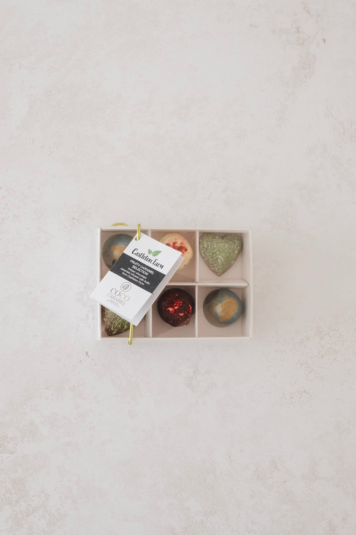 A celebration of fruit and craft, this special collection is made with the finest raspberries and cherries from Castleton Farm in Aberdeenshire. In collaboration with their farm shop, we’ve taken these vibrant flavours and paired them with our own caramels and ganaches to create something memorable.