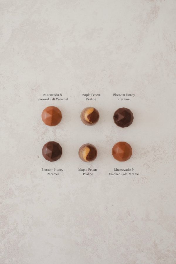 Great Taste Award 2 star & 1 Star chocolates - Salted Pecan and Maple Syrup Ganache, Smoked Sea Salt & Muscovado Caramel & Blossom Honey Caramel - 2 of each in one box