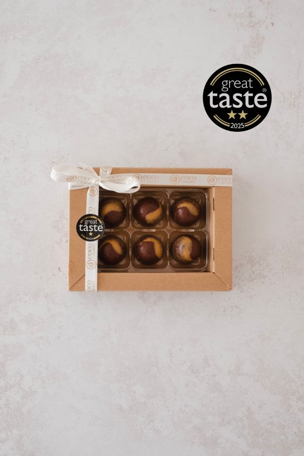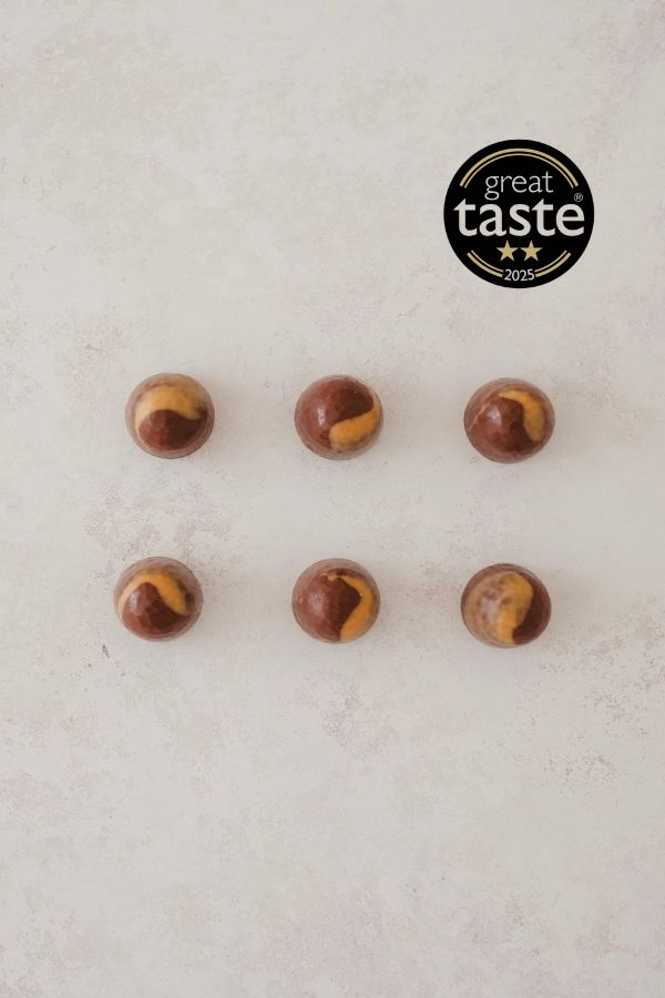 Our Salted Pecan and Maple Syrup Ganache won a Two Star award Great Taste Award at the 2025 Guild of Fine Food Taste Awards. These decadent creations are sweet and salty, with texture and a finishing crunch. Hand finished with a gold swirl, they're the ultimate gift for an inquisitive foodie.