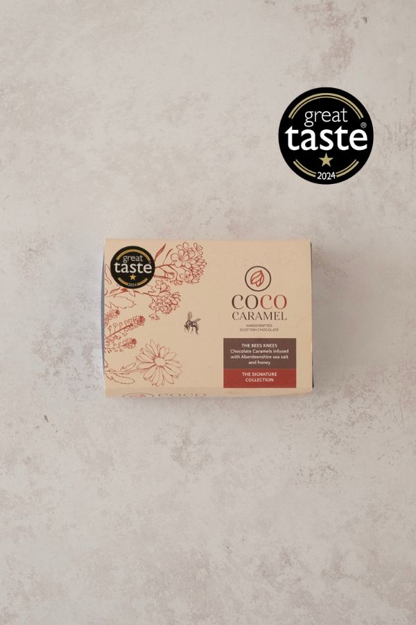 Butter (Milk), Vanilla Bean, Sea Salt), Dark Chocolate (Cocoa Mass, Sugar, Cocoa Butter, Emulsifier (Soya Lecithin), Natural Vanilla Flavouring), Milk Chocolate (Sugar, Cocoa Butter, Whole Milk Powder, Cocoa Mass, Emulsifier (Soya Lecithin), Natural Vanilla Flavouring), Udny Provender Blossom Honey, Muscovado Sugar, Stonehaven Sea Salt, Smoked Sea Salt, Flower Transfer (Curcumin, Titanium dioxide, Riboflavin, Anthocyanin, Soya Lecithin).